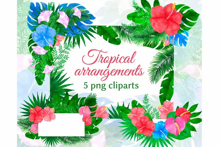 The set of watercolor Tropical floral clipart includes 2 frames and 3 tropical bouquets.