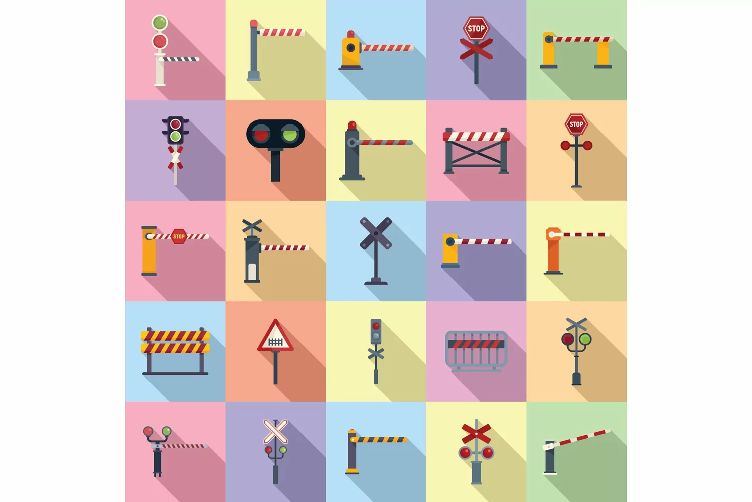 Railroad barrier icons set flat vector. Crossing railway. Sign barrier. Formats: JPG, EPS, AI, PSD,PNG, AI