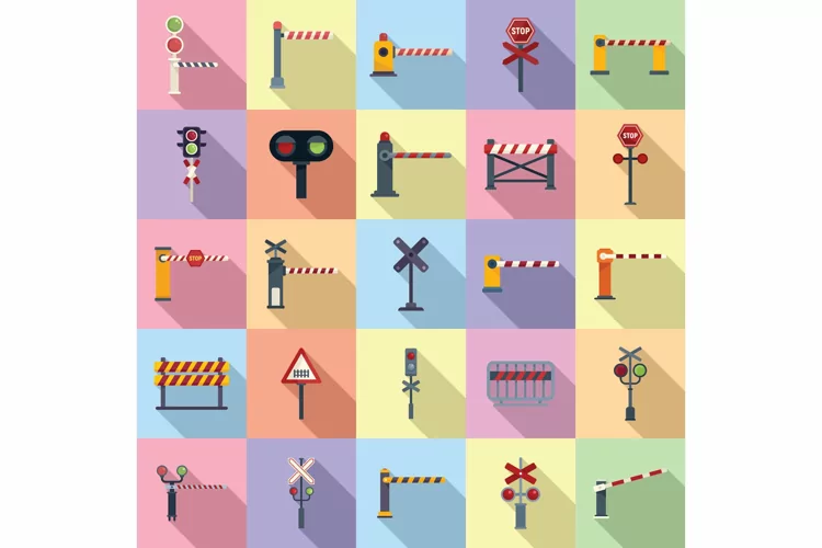 Railroad barrier icons set flat vector. Crossing railway example image 1