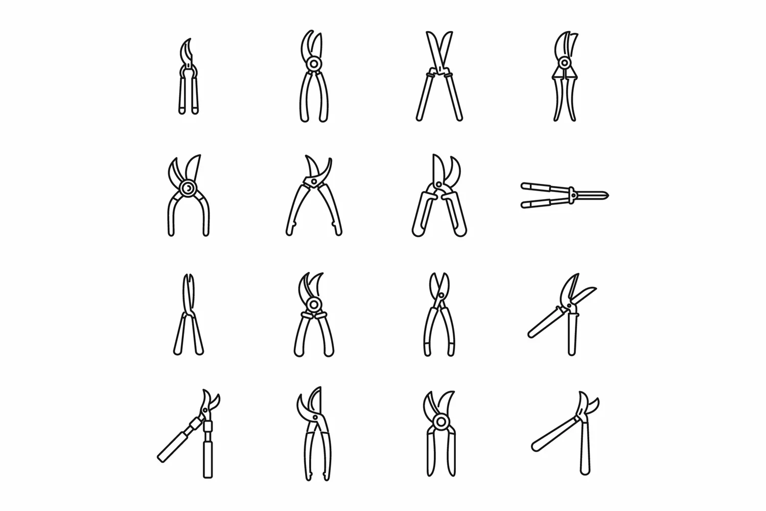 Secateurs icons set outline vector. Agriculture cut. Garden farm. Formats: JPG, EPS, AI, PSD,PNG, AI
