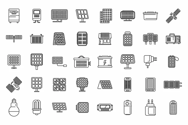 Solar panels icons set outline vector. Solar inverter. Energy battery. Formats: JPG, EPS, AI, PSD,PNG, AI