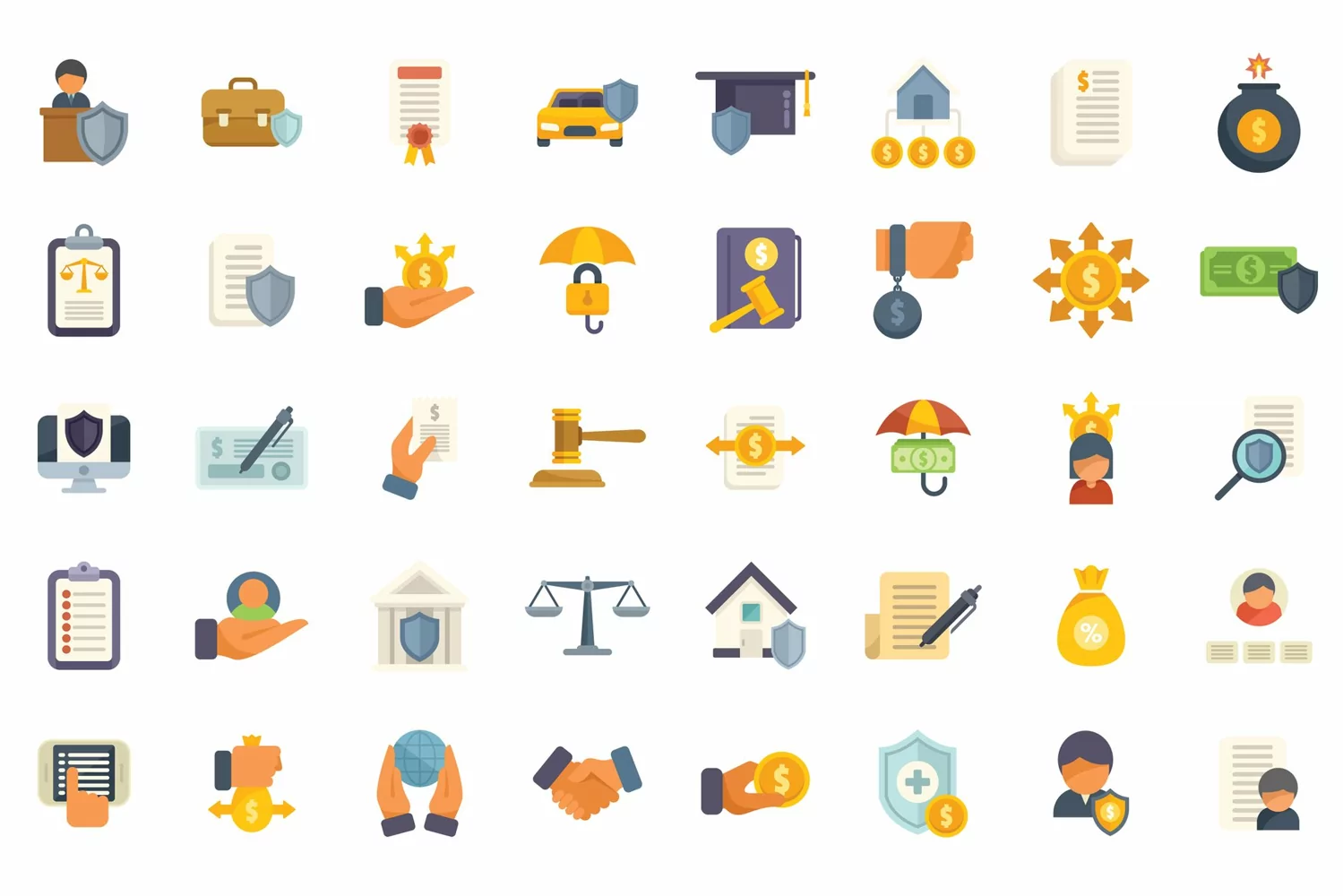 Liability icons set flat vector. Longevity annuity. Bill agreement isolated. Formats: JPG, EPS, AI, PSD,PNG, AI