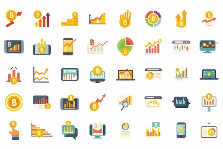 Bitcoin chart icons set flat vector. Benefit fintech. Cash coin isolated. Formats: JPG, EPS, AI, PSD,PNG, AI