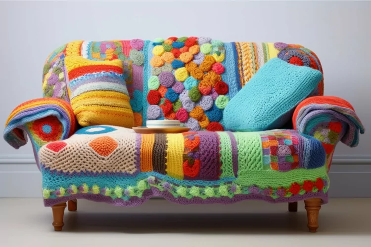 Cozy sofa. Interior plaid comfy. Generate Ai