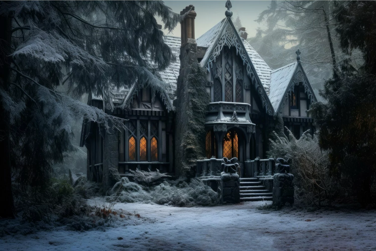 Antiquated Gothic vintage house. Winter old night. Generate Ai