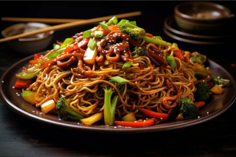Colorful Noodles stir fry. Cuisine dish plate. Generate Ai