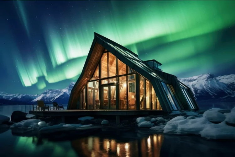 Serene Northern lights sky wooden house glow. Generate Ai example image 1