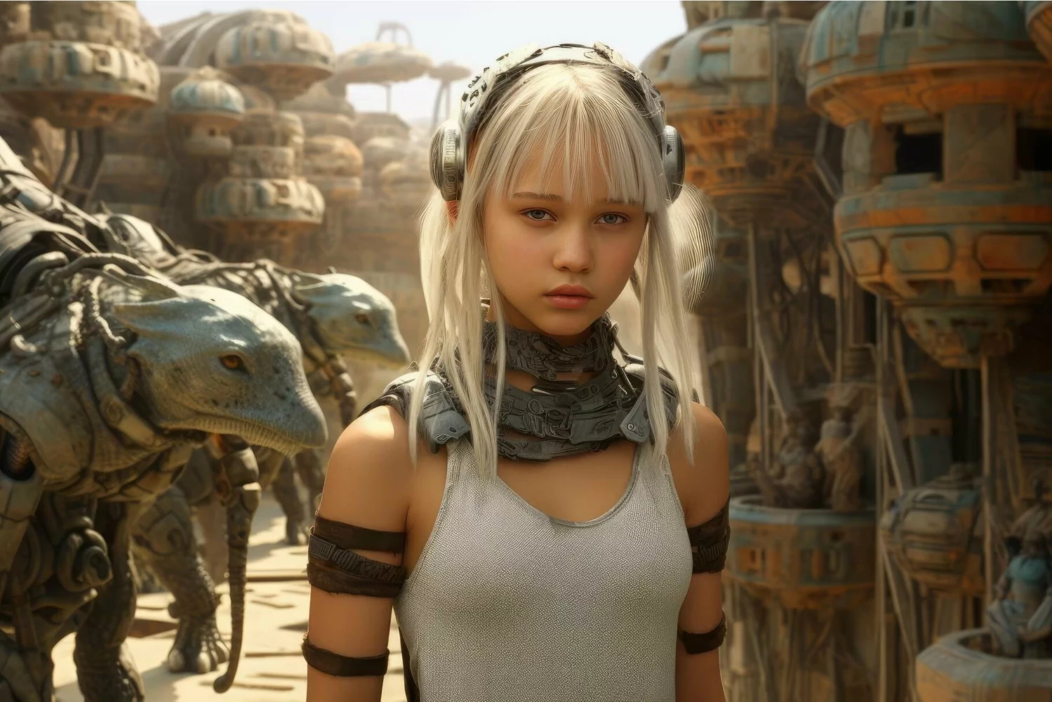 Youthful Prehistoric child girl future city. Generate Ai example image 1