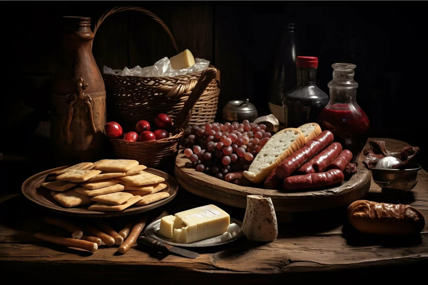 Crispy Polish traditional snack served in pan. Stewed food in tomato sauce dish on wooden table. Generate ai