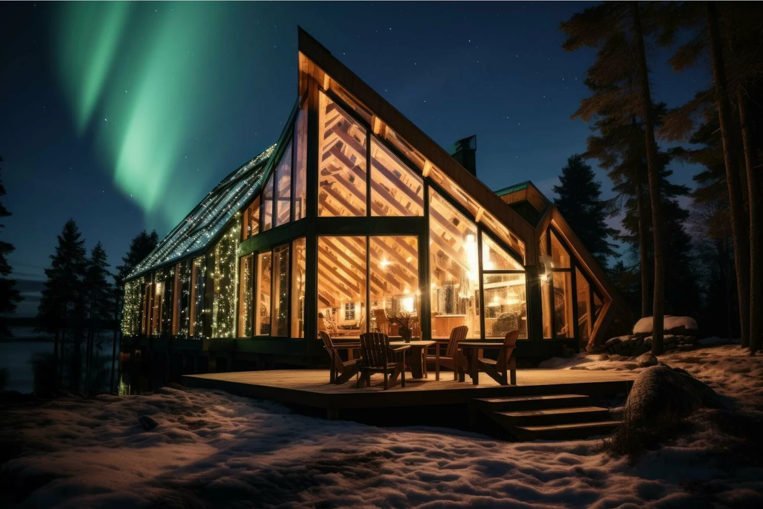 Tranquil Northern lights sky wooden house glow. Generate Ai example image 1