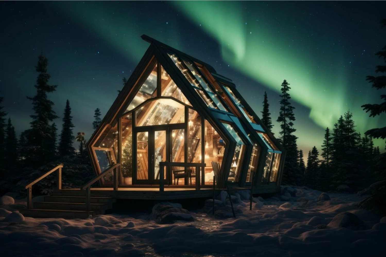 Picturesque Northern lights sky wooden house glow. Generate