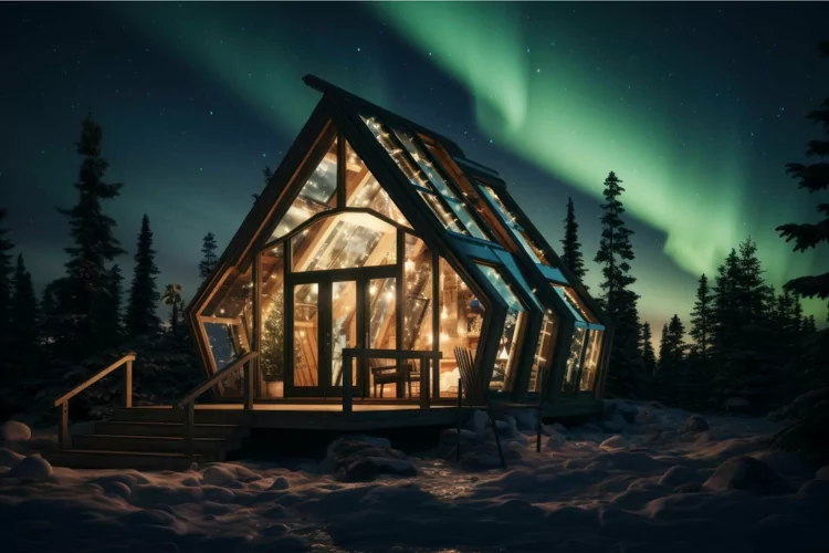 Picturesque Northern lights sky wooden house glow. Generate example image 1