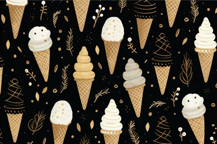 Seamless illustration featuring various ice cream cones and decorative elements on a dark backdrop