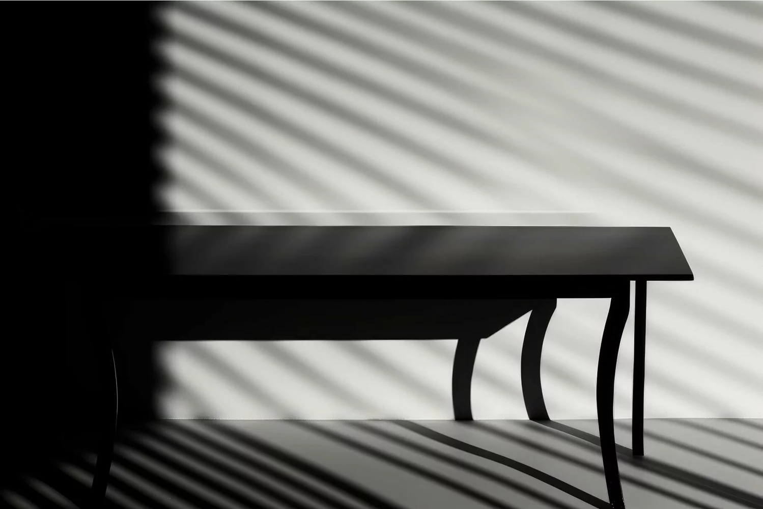 Black-and-white image featuring the silhouette of a bench against striped shadow patterns on a wall