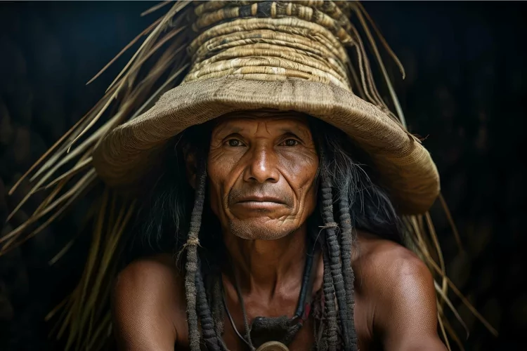 Portrait of a native man wearing a unique woven hat, displaying rich cultural heritage