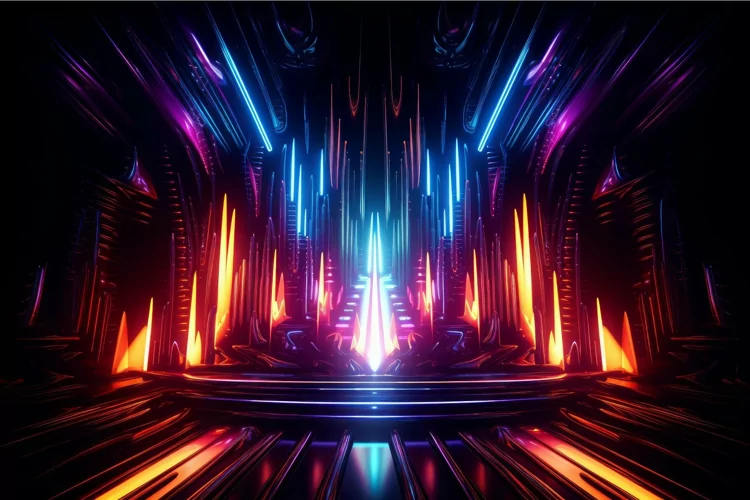 Vibrant and futuristic neon tunnel entrance with digital illustration and abstract technology concept in a modern cyberpunk sci-fi perspective design
