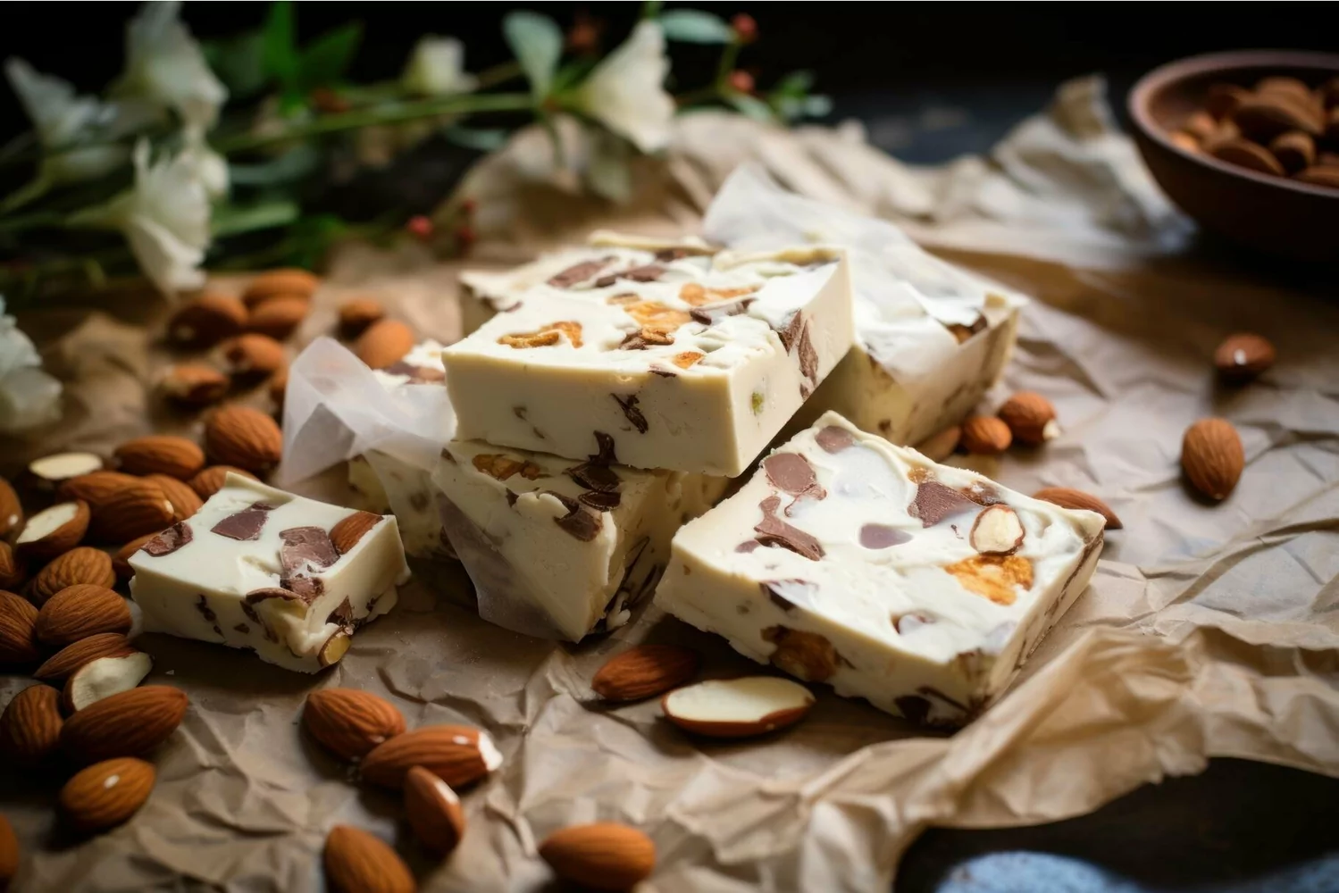 Decadent Nutty nougat. Sugar dessert calories. Generate Ai