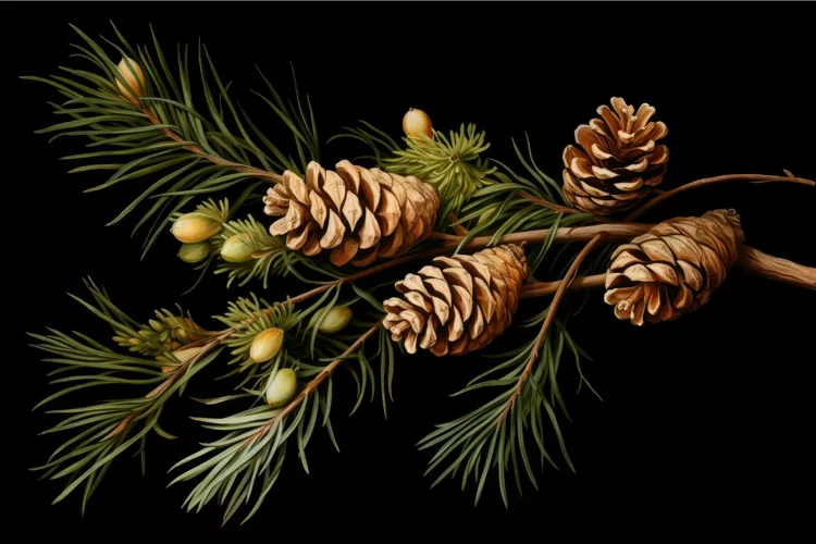 Illustration of detailed pine cones and green needles isolated on a dark background