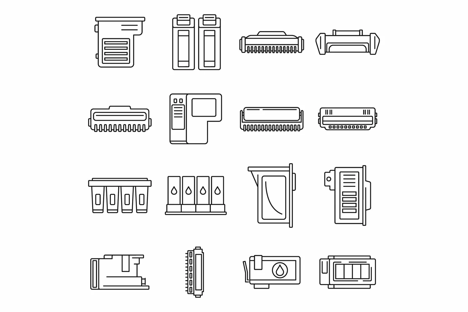Printer cartridge icons set. Outline set of printer cartridge vector icons for web design isolated on white background