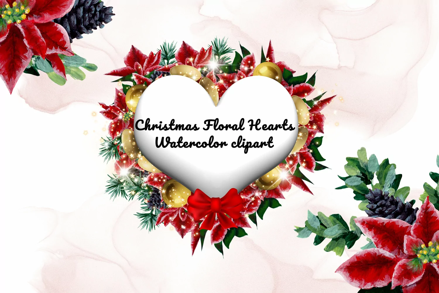 This collection includes hand painted Golden Christmas Flower Heart Frames, perfect for fabric, apparel, kids clothes, baby shower, packaging, sublimation printing, scrapbooking, stickers, mugs, card-making, invitations,decorating your blog or website.