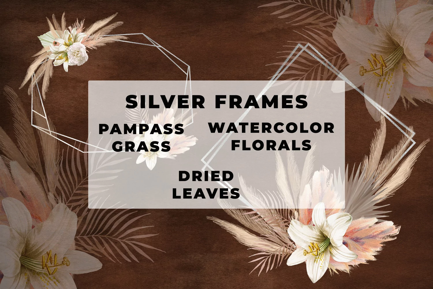 This collection includes hand painted Pampass Grass Silver Frame, perfect for fabric, apparel, kids clothes, baby shower, packaging, sublimation printing, scrapbooking, stickers, mugs, card-making, invitations,decorating your blog or website.