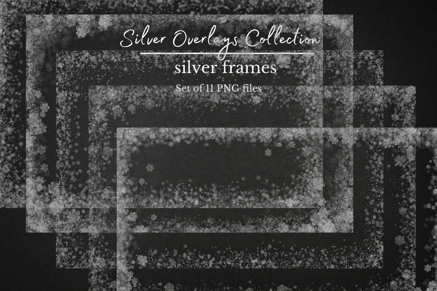 You will receive 11 silver frames. There are in high resolution PNG files with transparent background. Approximately size of one image: 5000 px on 3500 px and 300 dpi. There are ready to use (RGB colorspace).