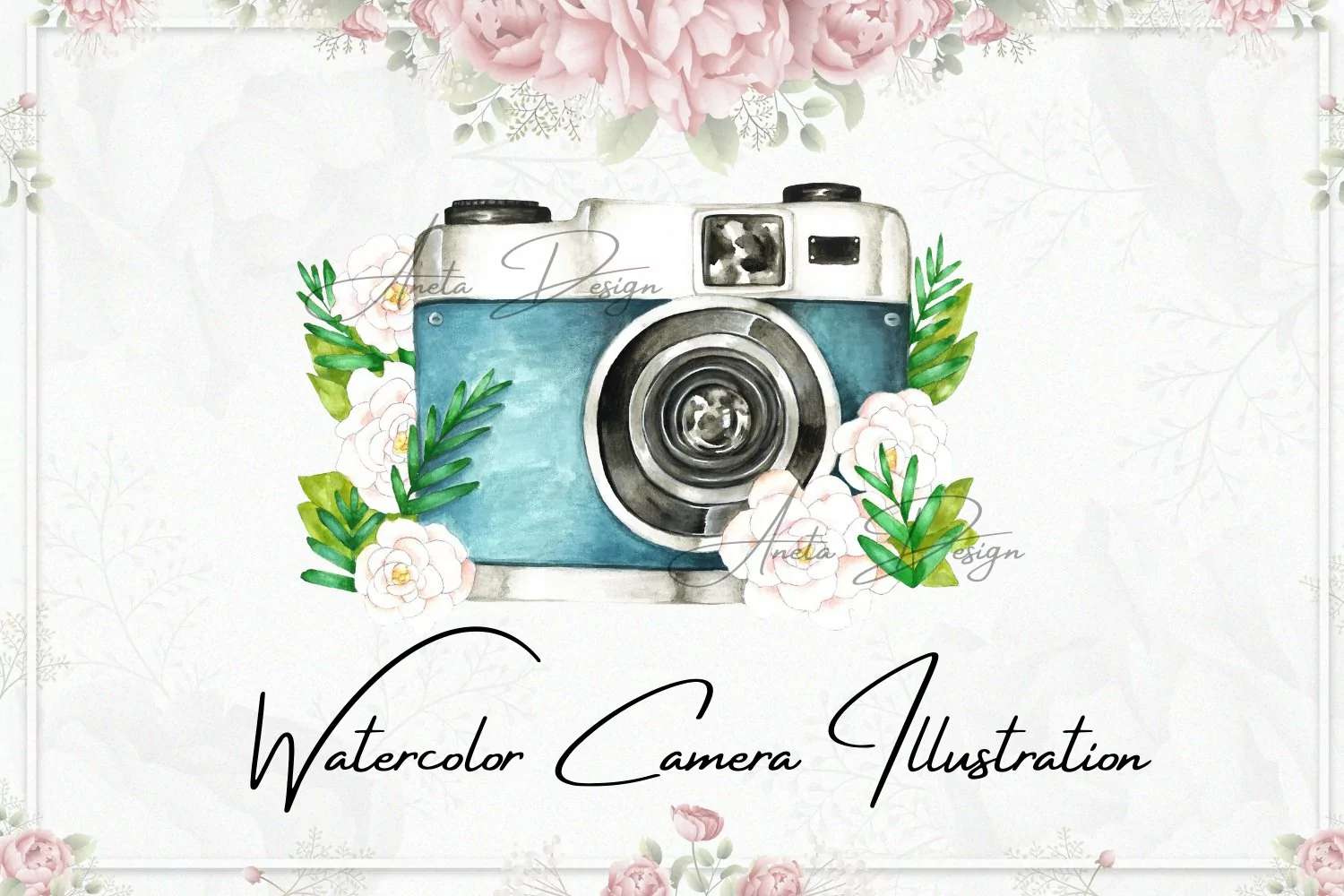 Beautiful vintage camera illustration. Perfect hand painted watercolor camera with flowers, great for wedding invitations, greeting cards, party invitations, posters, birthday projects, flyers, brochures, covers, presentations, print templates, scrapbooking artworks, baby shower and so on.