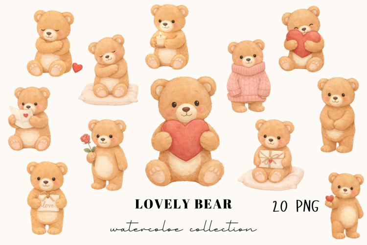 This collection features 20 watercolor teddy bears in adorable poses – holding hearts, letters, gifts, flowers, candles, and enjoying cozy moments.