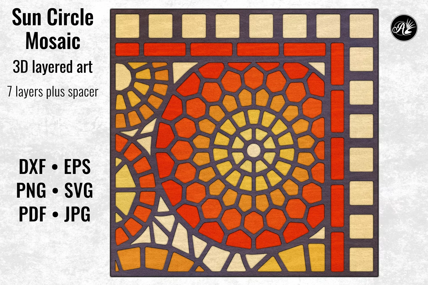 The Sun Circle Mosaic design comes in DXF, EPS, PDF, PNG, JPG, and SVG files to work with whatever equipment and software you have. There are 7 layers in this art, plus I've added a spacer to add depth to your 3D designs.