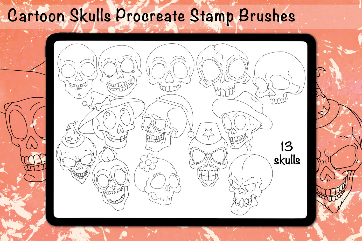 • A Procreate brushset file with 13 hand-drawn Cartoon Skulls Procreate Stamp Brushes. Rotate your canvas in Procreate to change the orientation of the stamps.