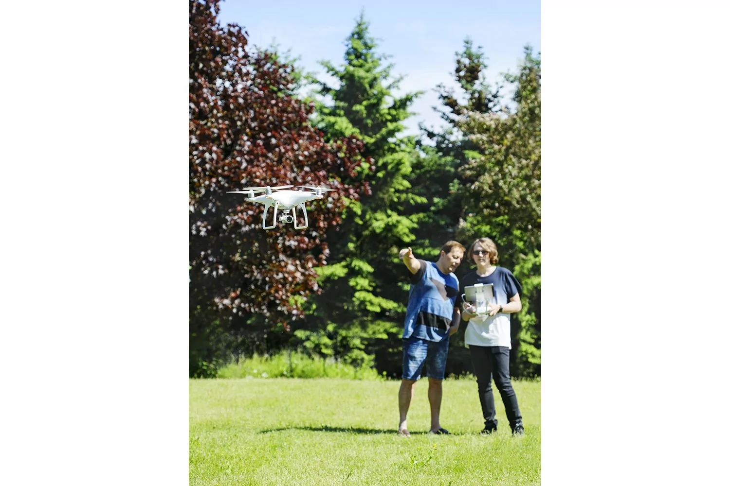 Father and son on summer day flying drone on countryside. Focus on drone.