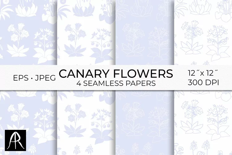 Exquisite "Canary Flora Millefleurs" seamless patterns set, featuring intricately hand-drawn monochrome blue and white motifs inspired by canary flora (stylized mallow bindweed, tree sonchus, blue violet, Tenerife nightshade, parrot beaks, bellflower). Perfect for wallpaper, textile, bedding, and more, these patterns bring a touch of nature's elegance to your creative projects. The set includes EPS10 vector files for easy customization and high-resolution JPGs at 300 dpi for seamless printing.