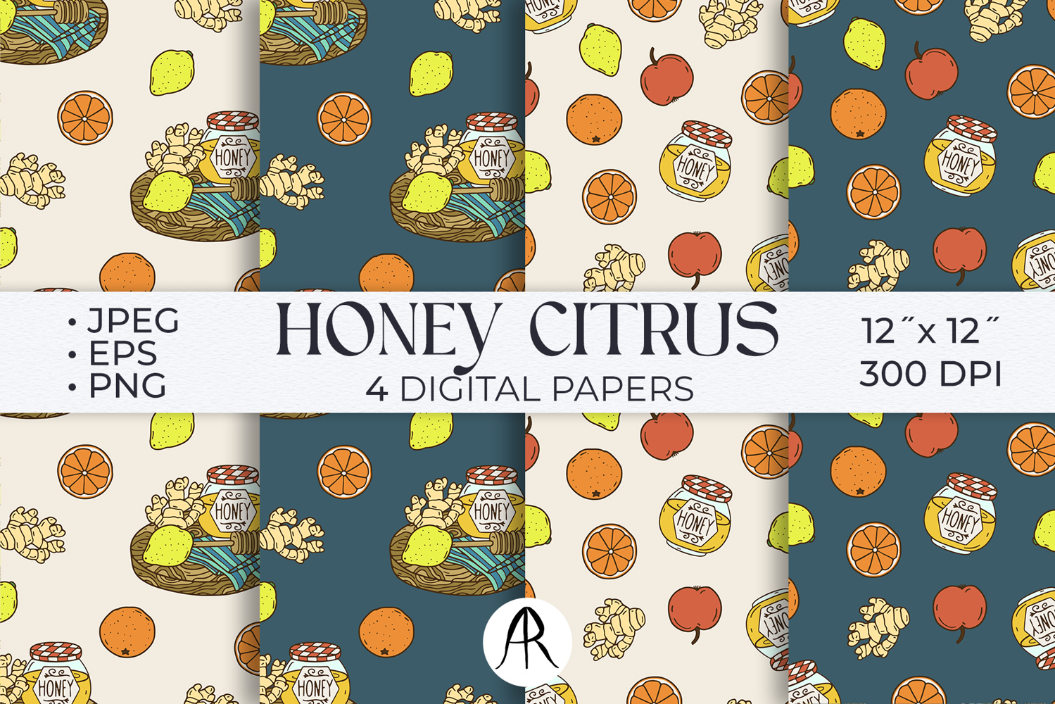 Indulge in the cozy warmth of Sweet Honey & Autumn Harvest seamless patterns. This cute set features a hand-illustrated golden honey jars, spicy ginger root, crisp apples, zesty lemons, and juicy oranges. With soft beige and blue, these designs strike the perfect balance between rustic farmhouse charm and modern kitchen aesthetics. Whether you are designing scrapbooking paper, kitchen textiles, or seasonal branding, these high-quality seamless repeats bring a comforting, organic feel to any creative project.