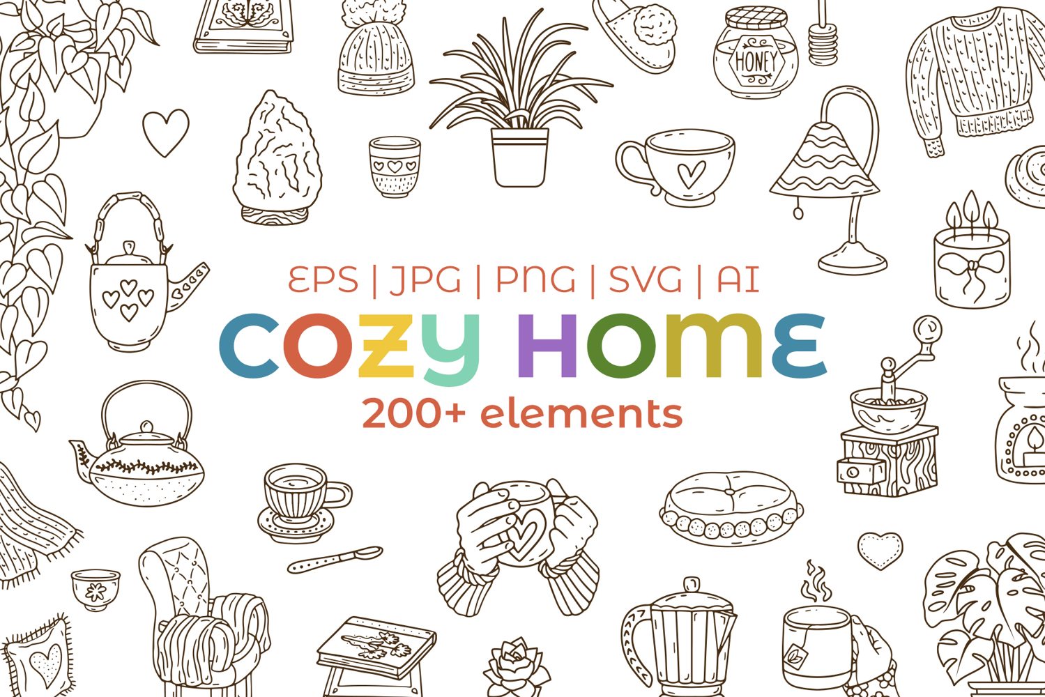 - 200+ Graphics in vibrant color: PNG (300 dpi), SVG, 1 EPS all elements, 1 Adobe Illustrator file with all elements.