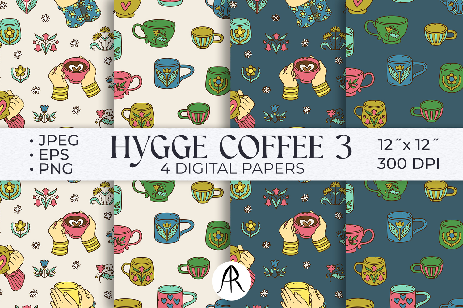 Bring warmth and Scandinavian charm to your creative projects with this Cozy Coffee Cups Seamless Digital Paper Set. Featuring cozy illustrations of hand holding coffee and tea cups, this set is perfect for scrapbooking, invitations, product packaging, sublimation, or digital backgrounds. Designed to inspire calm, comfort, and creativity, these seamless coffee-themed patterns add the perfect cozy touch to any project.