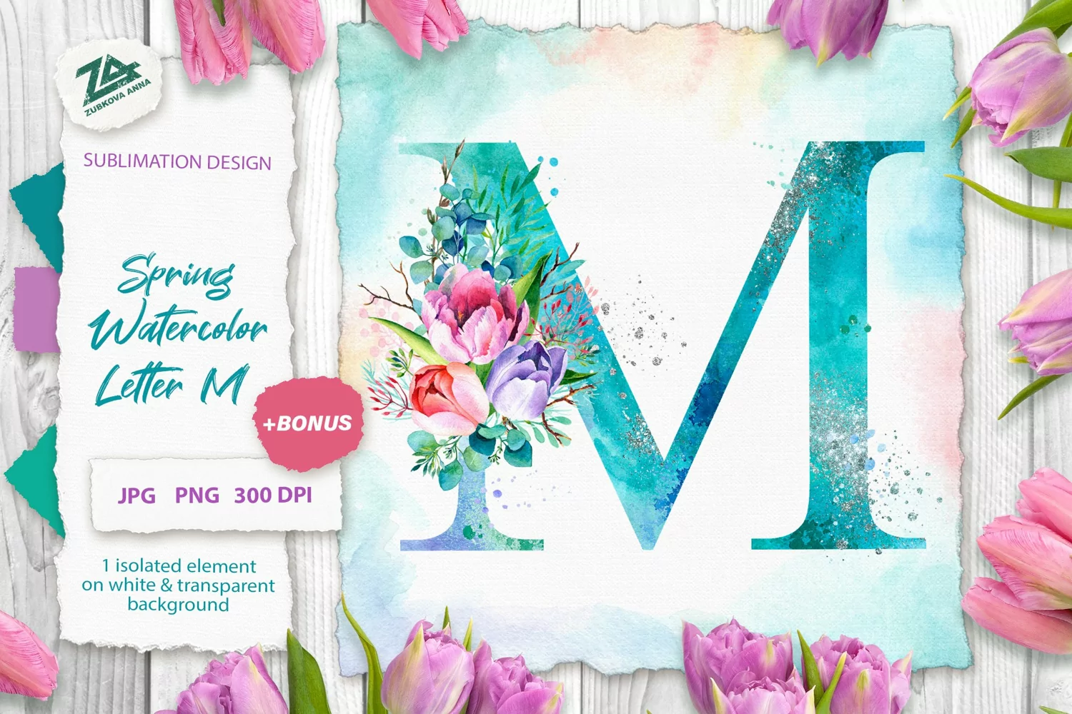 Spring Watercolor Letter, Monogram M. Watercolor Sublimation Design. Watercolor letter with Tulips.