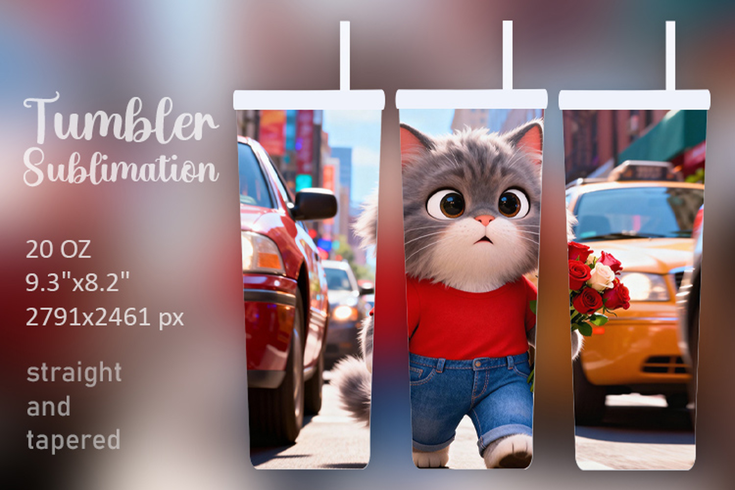 Bring urban charm to your drinkware with this adorable 3D cartoon cat with roses dressed in a red shirt and denim shorts, walking on a bustling city street. Perfect for sublimation printing on 20oz tumblers, it’s available in both straight and tapered versions for a flawless fit.