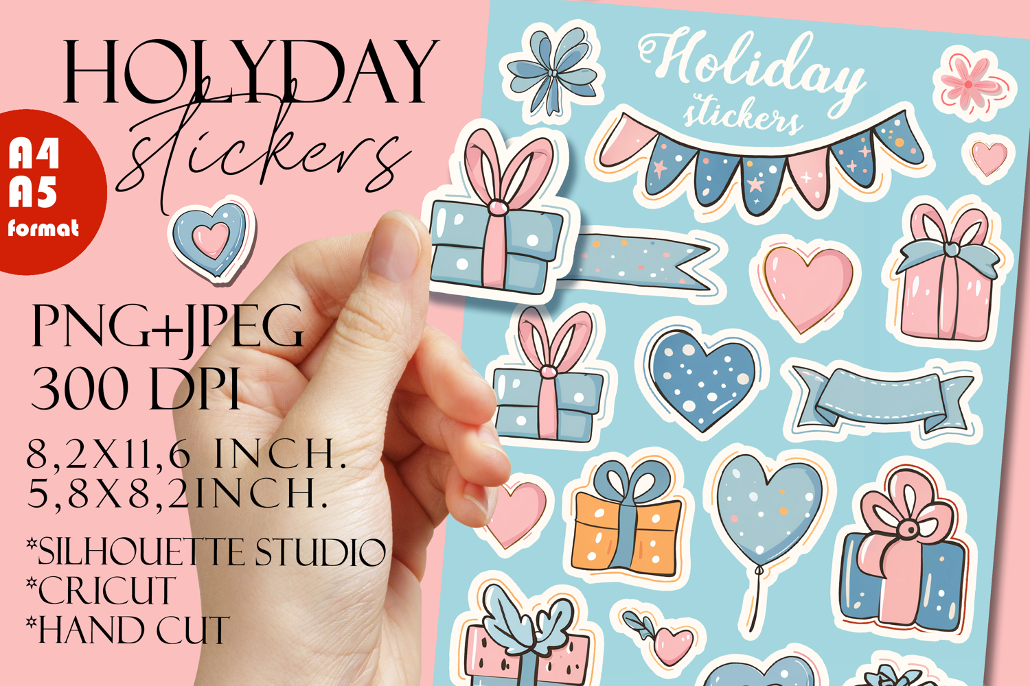 • JPG + PNG files with sticker sheet + PNG A4 size [8,2x11,6’’] and A5 size[5.8x8.2"] with all stickers with white borders and background