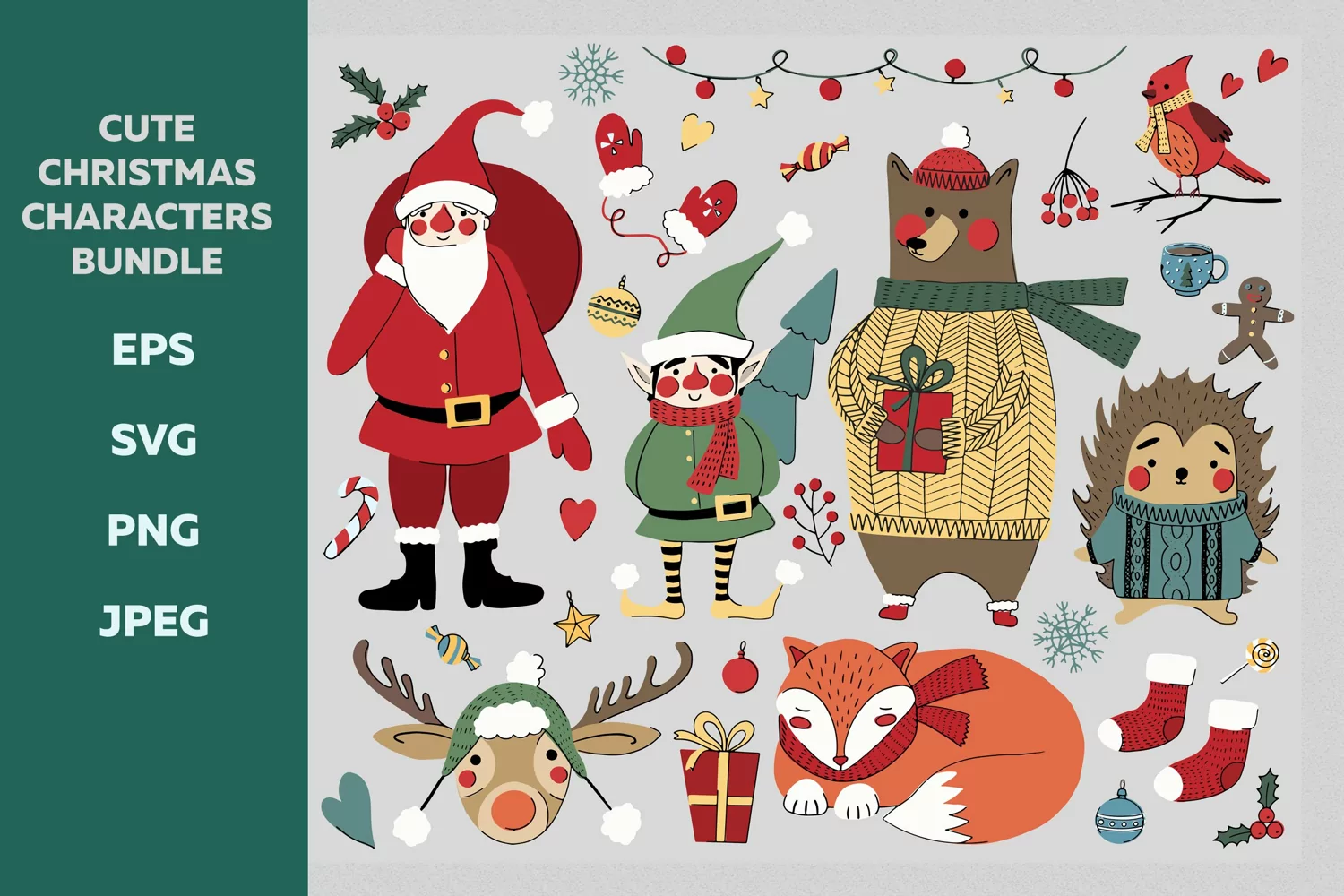Christmas characters - Santa, Elf, Bear, Deer, Fox, Hedgehog