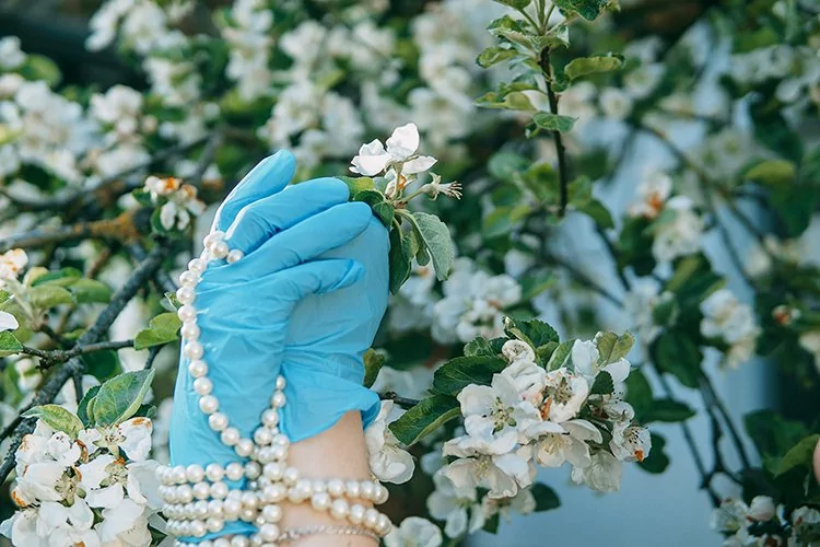 Women's hands in medical gloves and a pearl bracelet. Fashion 2020. Fashion during the pandemic. Decoration for your hands during coronavirus. Hand jewelry.