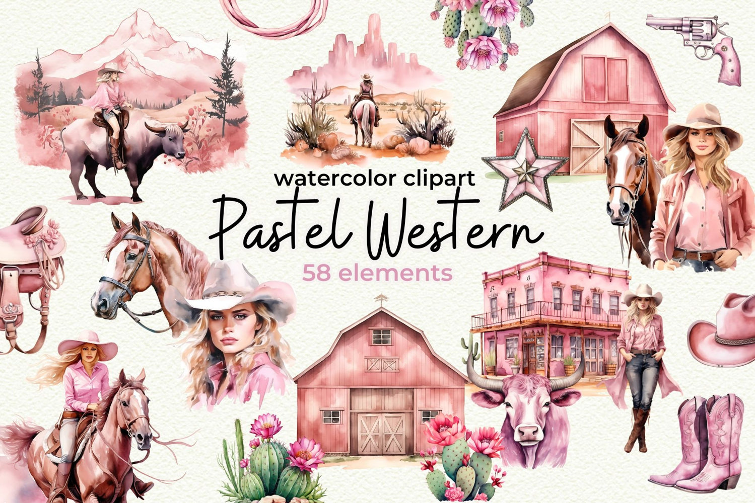 Saddle up for some pastel charm with this Pastel Western Watercolor Clipart Set! This adorable collection features soft-toned cowgirls, boots, hats, cacti and western accessories — all in dreamy pastel colors. Perfect for creating cute nursery art, party invitations, apparel designs and more with a cozy country aesthetic.