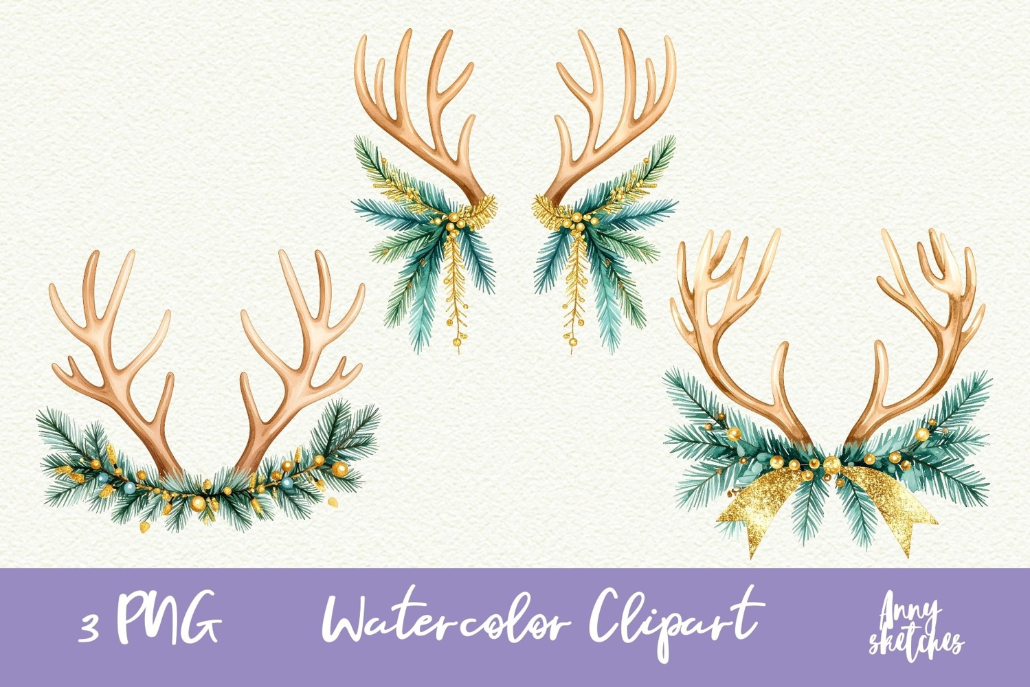 3 Vintage Christmas Reindeer Antlers Clipart Retro PNG example image 1