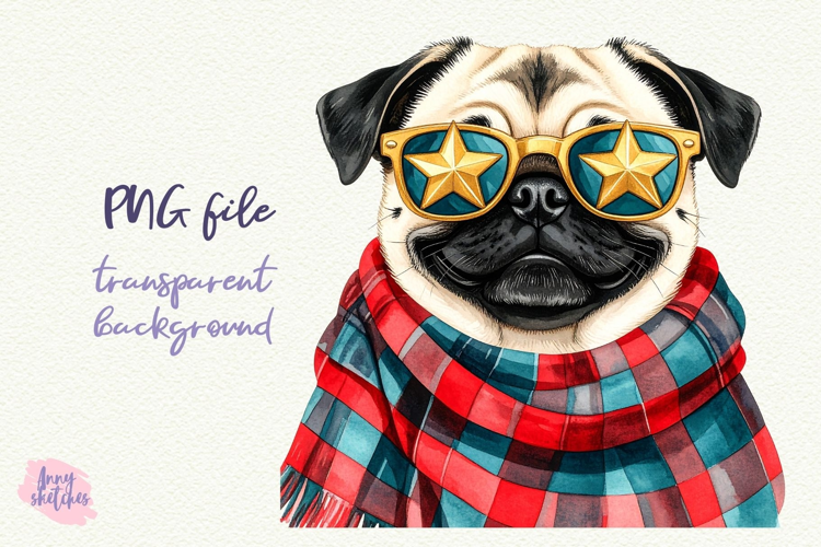 Vintage Christmas Pug Clipart Retro Christmas Dog PNG example image 1
