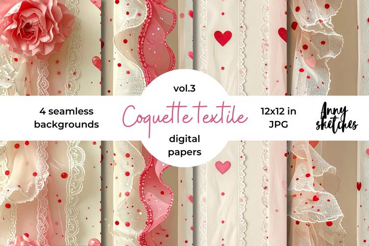 This Coquette Textile Valentine Digital Paper Kit features delicate white tulle, sheer netting textures, and soft pink heart embroidery. Designed in a romantic Rococo style, these seamless patterns are perfect for dreamy Valentine, lingerie-inspired, and coquette aesthetic designs.
