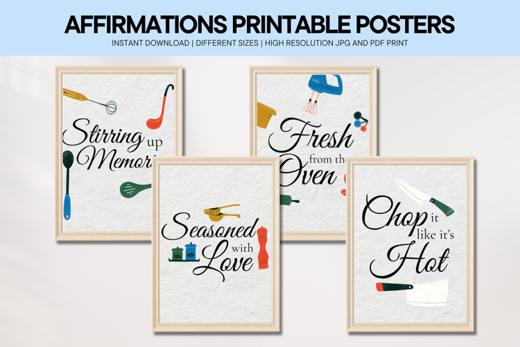 A set of kitchen-themed posters designed to brighten up cooking and dining spaces.
