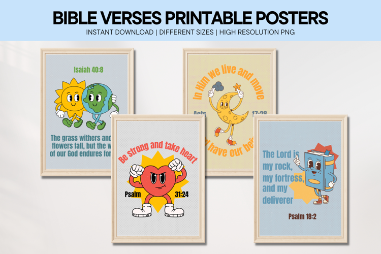 Uplifting Bible verse prints in groovy retro typography with playful colors. A fun and unique way to display faith-inspired messages with a vintage aesthetic.
