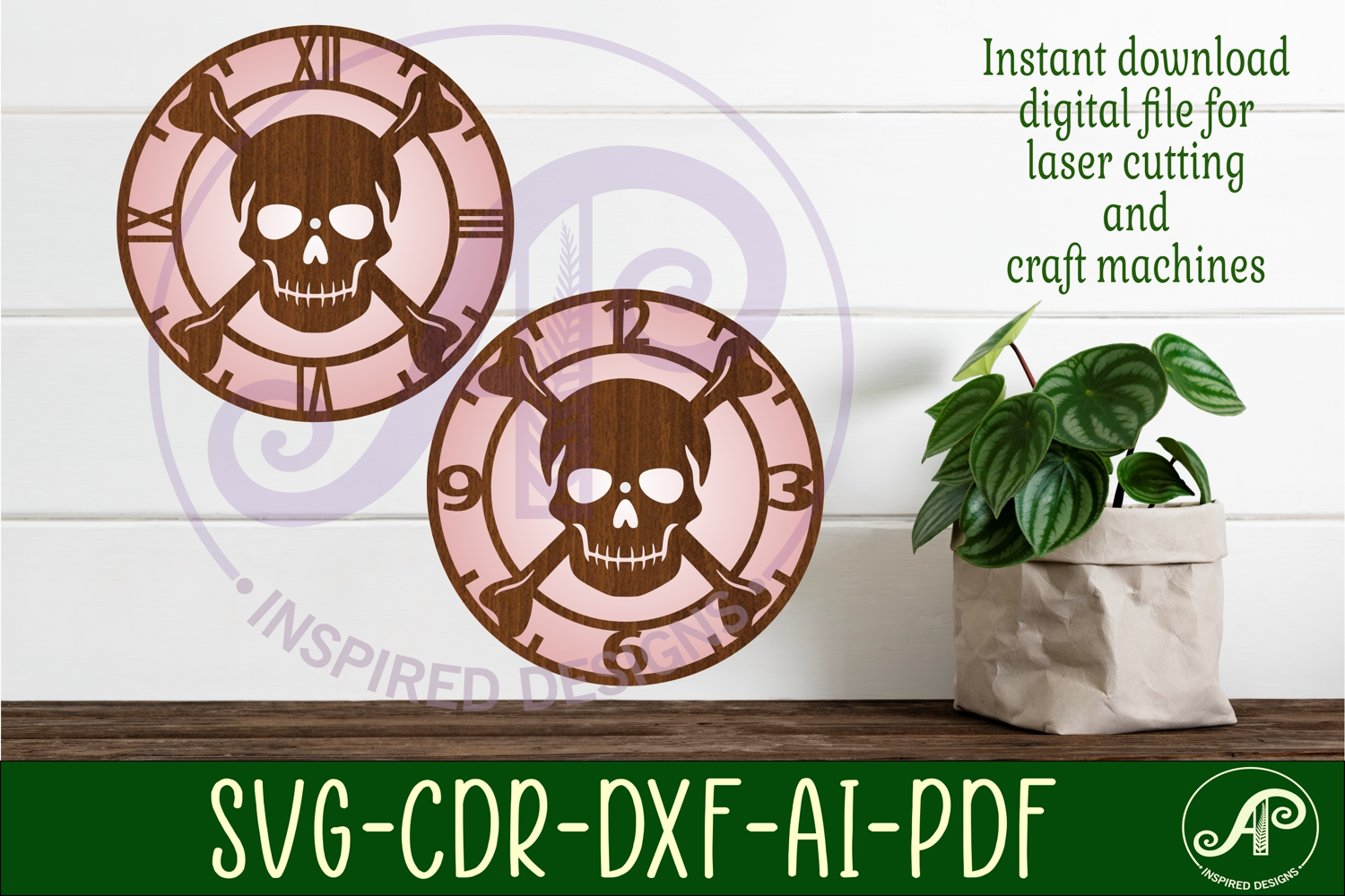 Skull and crossbones themed clock wall clock laser cut files