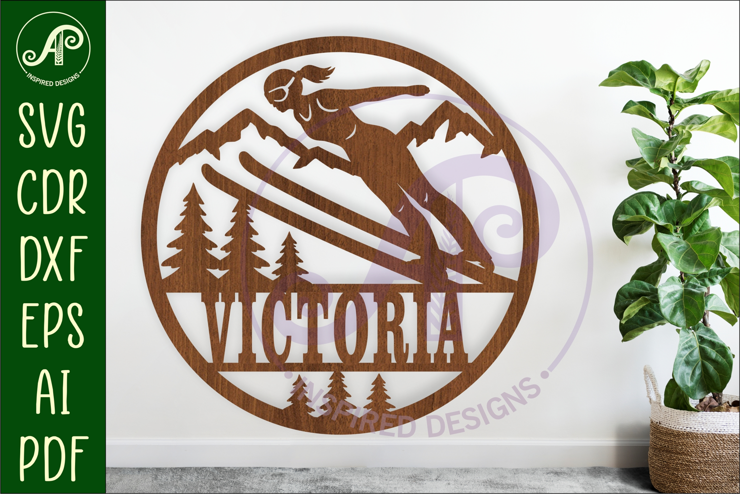Create a unique and personalised ski jumper name sign with this elegant female skier design. Featuring a dynamic ski jumping silhouette with mountains and trees, this file is perfect for adding a sporty and modern touch to any space.. This design is saved in SVG Laser Cut Files for laser machines, CNC routers and other craft machines. in DXF, AI, filled SVG single layer, PDF and CDR formats.