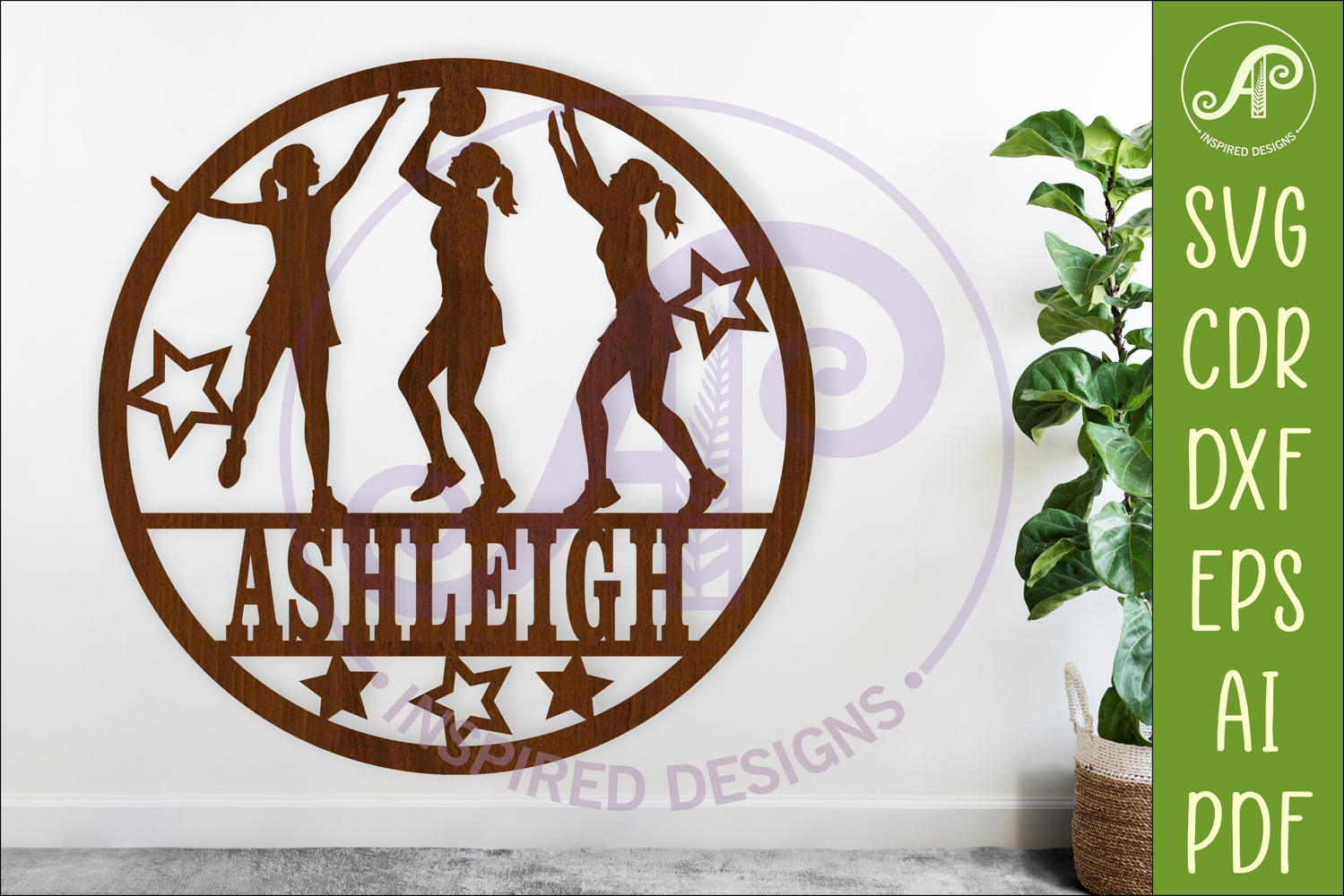 Create a personalized netball name sign featuring three female player silhouettes in action. This clean, single-layer design is perfect for laser cutting and makes a standout piece for any netball lover’s room.