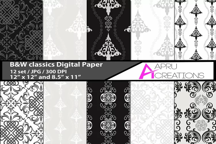 B&W classic digital papers, B&W classic pattern, digital papers, high quality 300 dpi, 12 x 12 inch , and 8.5 x 11 inch